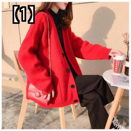 ニット カーディガン レディース 春 アウター 長袖 Vネック ゆったり 赤 茶色 無地 カジュアル シンプル おしゃれ ポケット 秋 ミドル丈 韓国