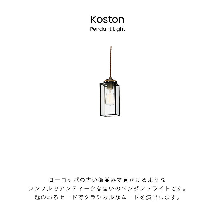 商品について 商品名 Kostonコストン ペンダントライト サイズ W10.5 x D10.5 x H24.5 cm全高 41cm 〜 100cm まで調節可能 材 質 ガラス、スチール 重 量 1.1 〜 1.2 kg スイッチ 壁スイッチ ※点灯→消灯 電 球 [白熱球]E26/100W クリアハウス球[レトロ球]E26/60Wレトロ球[LED電球]E26/60W相当一般球形LED電球(電球色) 備 考 リビング用 / ダイニング用 / 寝室用 / トイレ用 / 洗面所用 / キッチン用 / 玄関用 / 書斎用 / 店舗用 / ワンルーム用 ヨーロッパの古い街並みで見かけるような、シンプルでアンティークな装いのペンダントライトです。