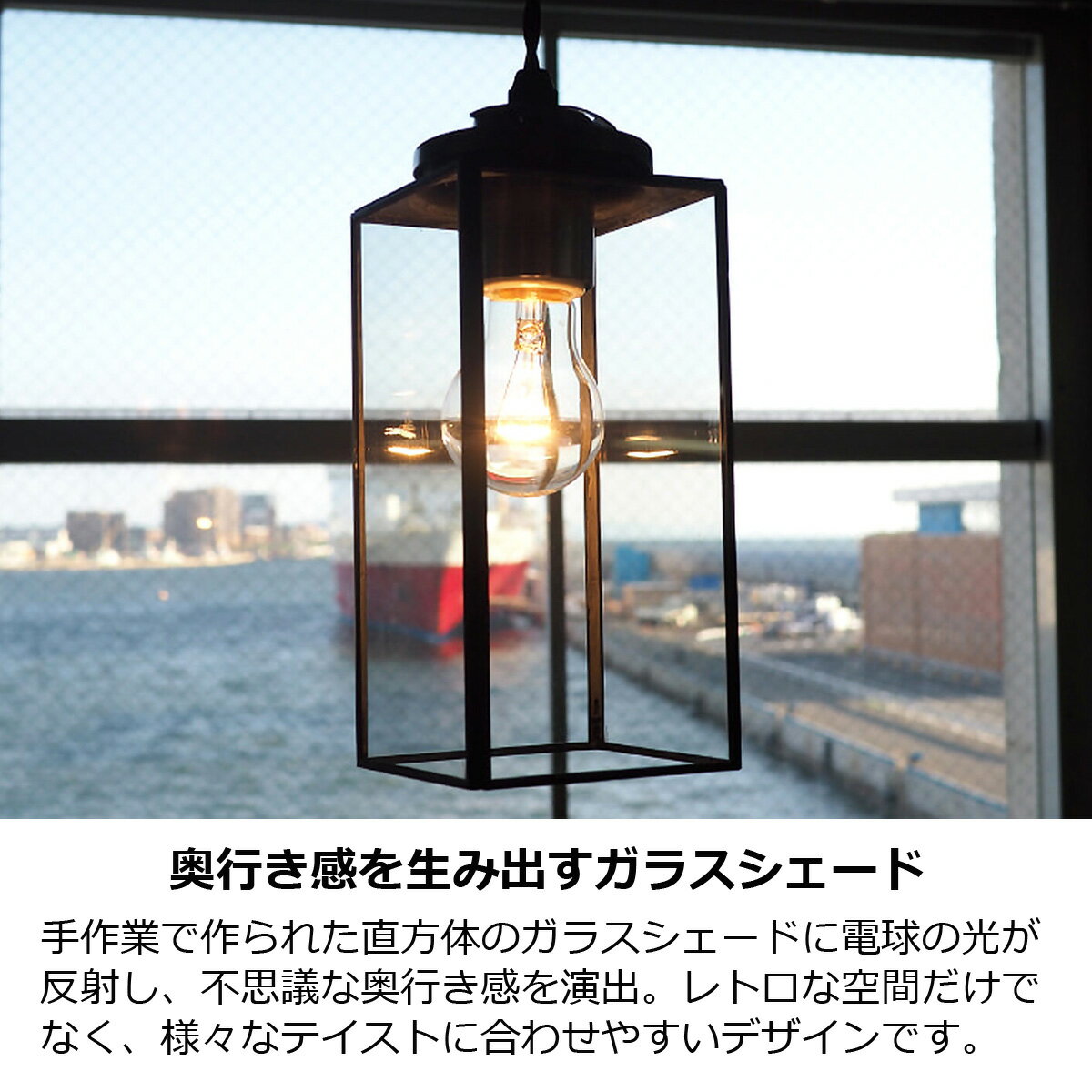 ■ 奥行き感を生み出すガラスシェード 手作業で作られた直方体のガラスシェードに電球の光が反射し、不思議な奥行き感を演出。