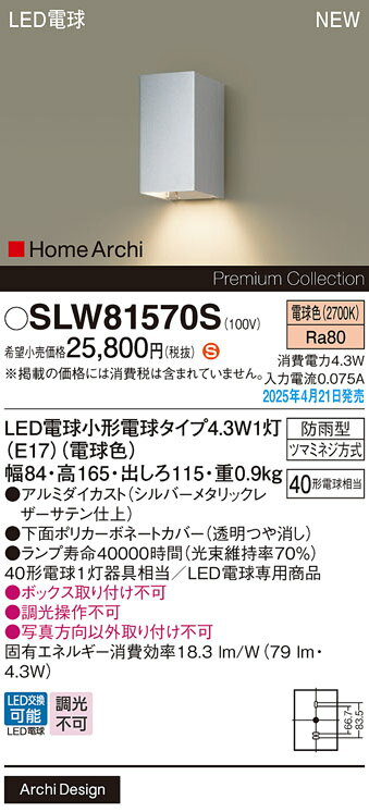 商 品 詳 細商品名パナソニック エクステリアライトメーカー名パナソニック Panasonicメーカー器具名称エクステリアライト ブラケットライト ポーチライト光源◆LED電球小形電球タイプ3.4W1灯(E17)(電球色)◆色温度:2700 K ◆光源寿命40000時間(光束維持率70%)寸法・質量◆幅:84 mm ◆高:165 mm ◆出しろ:115 mm◆質量:0.9 kg仕様◆全光束:83 lm ◆電圧:100 V ◆消費電力:3.4 W ◆消費効率:24.4 lm/W◆デザイン分類:Stylish Modern◆【アルミダイカスト】シルバーメタリックレザーサテン仕上◆【下面ポリカーボネートカバー】透明つや消し◆Ra80◆40形電球1灯器具相当◆LED電球専用商品◆入力電流(100V時):0.06 A◆ボックス取り付け不可◆調光操作不可◆写真方向以外取り付け不可注意事項◆調光操作不可 ◆写真方向以外取り付け不可 ※施工・電気工事は専門業者にご依頼ください。