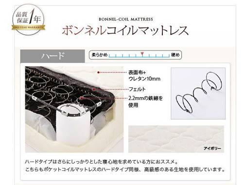 プレミアムボンネルコイルマットレス【サイズ】シングル:(約)幅97×長さ195×高さ22cm セミダブル:(約)幅120×長さ195×高さ22cmダブル:(約)幅140×長さ195×高さ22cm【主な材質】線径2.2mmボンネルコイル(コイル数/シングル:412、セミダブル:512、ダブル:578)中材:ウレタン、フェルト側地:ポリエステル(シルク配合)(両面多針キルティング加工、抗菌・防臭・防ダニ加工)【カラー】ホワイト、ブラック【品質保証】5年間【梱包サイズ・重量】シングル:(約)39×39×98cm・25kgセミダブル:(約)39×39×121cm・33kgダブル:(約)39×39×141cm・36kg※ロールパッケージでお届けします。
