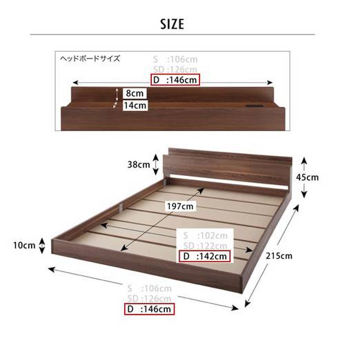 ベッド本体【サイズ】シングル:(約)幅106x長さ215x高さ45cmセミダブル:(約)幅126x長さ215x高さ45cmダブル:(約)幅146x長さ215x高さ45cm【材質】化粧繊維板【カラー】ウォルナットブラウン、オークホワイト【機能】1口コンセント(1200W)【品質保証】1年間【梱包サイズ・重量】梱包数:1シングル:(約)108x48x19cm・26kgセミダブル:(約)128x48x19cm・28kgダブル:(約)148x48x19cm・31kg※各サイズ・重量は概算です。