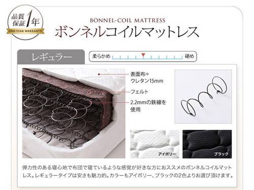 プレミアムボンネルコイルマットレス【サイズ】シングル:(約)幅97×長さ195×高さ22cm セミダブル:(約)幅120×長さ195×高さ22cmダブル:(約)幅140×長さ195×高さ22cm【主な材質】線径2.2mmボンネルコイル(コイル数/シングル:412、セミダブル:512、ダブル:578)中材:ウレタン、フェルト側地:ポリエステル(シルク配合)(両面多針キルティング加工、抗菌・防臭・防ダニ加工)【カラー】ホワイト、ブラック【品質保証】5年間【梱包サイズ・重量】シングル:(約)39×39×98cm・25kgセミダブル:(約)39×39×121cm・33kgダブル:(約)39×39×141cm・36kg※ロールパッケージでお届けします。