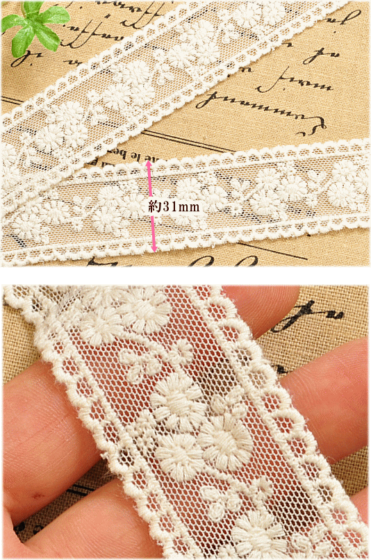 素材 刺繍部分:綿100%メッシュ部分:ナイロンサイズ幅:約31mm5ヤード(約4.5m) お色 生成りゆうパケット6個まで可能 稀に糸の絡みがある場合がございます。